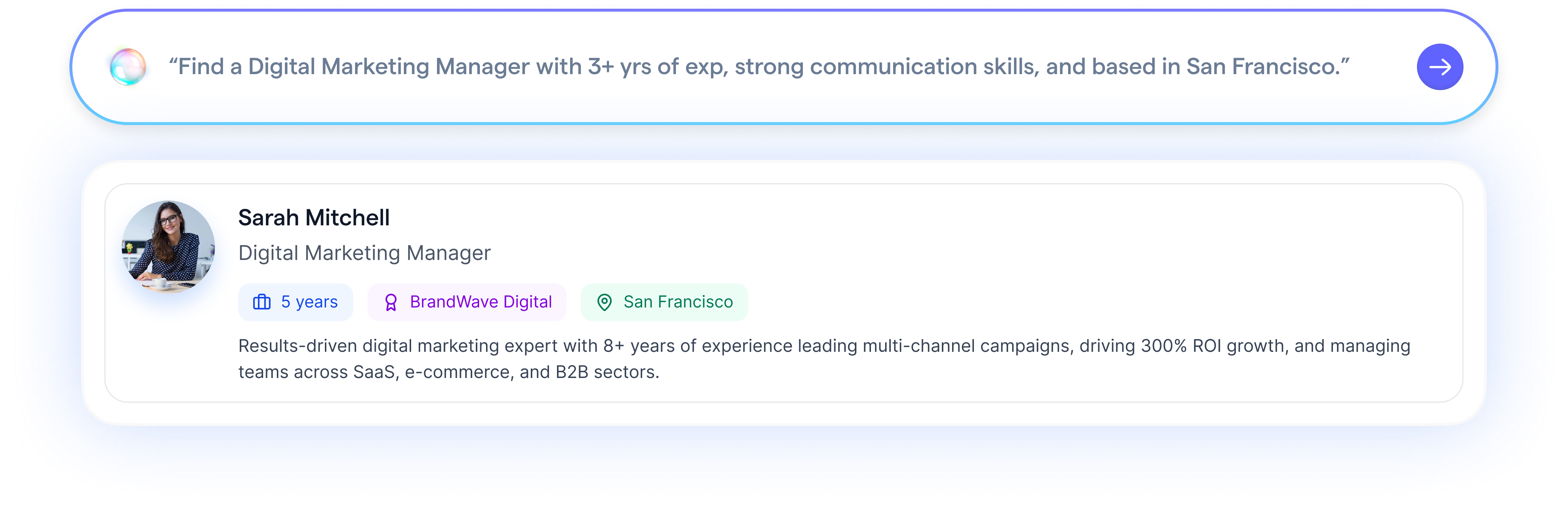 You can ask things like: “Who’s best for this role?”, “Compare these candidates,” or “Who matches X and Y?” and get clear answers to speed hiring decisions.