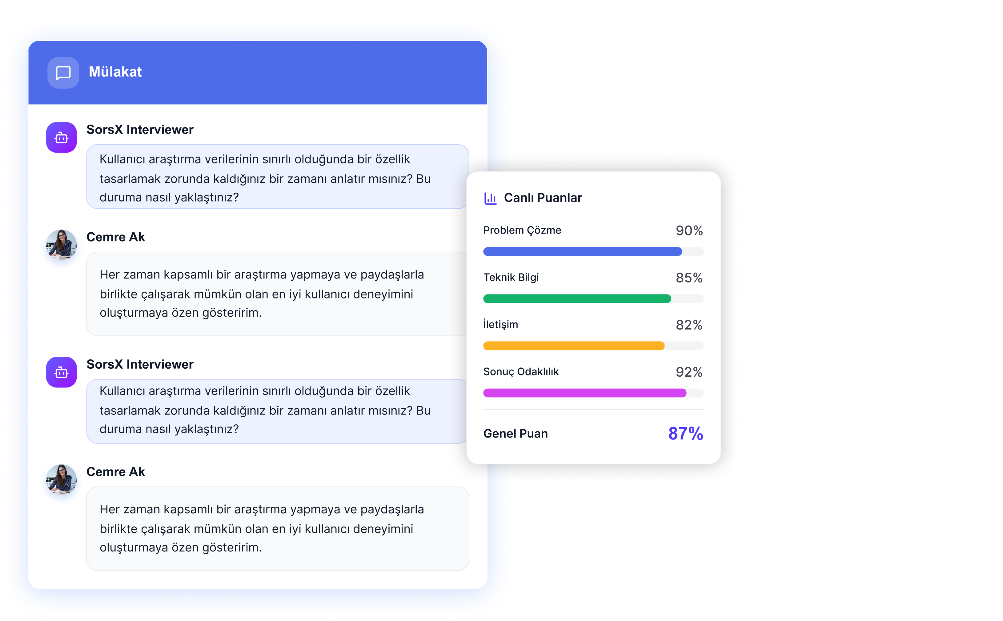 Projé, son altı aydır SorsX’in AI mülakat sürecini kullanıyor. Ön eleme ve ilk mülakatları hızlandırma konusunda gerçekten oyunun kurallarını değiştirdi. Kısa listeye ilerleteceğimiz adaylar hakkında bilinçli kararlar almamız için ihtiyaç duyduğumuz her şeyi net bir şekilde sunuyor.